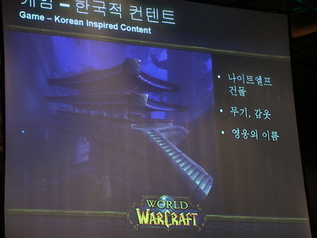 예를 들어 나이트엘프 수도에 있는 거대한 대문은 우리나라의 남대문과 흡사하다. 이러한 요소들은 국내 버전에만 등장하는 것이 아닌, 전 세계에서 서비스 될 모든 WOW에서 동일하게 포함될 것이라고 하니 블리자드가 한국 시장을 얼마나 신경 쓰는지 짐작할 수 있다. 일부 독자들은 이러한 요소가 자칫 게임의 분위기를 망치지 않을까 우려할지도 모르겠지만, 원래 나이트엘프에 등장하는 여러 가지 요소가 일본의 건축물에서 그 모티브를 따온 것이므로 (문웰이나 헌터즈 홀, 여러 가지 엔션트의 형태를 떠올려보자) 그런 걱정은 접어두도록 하자.