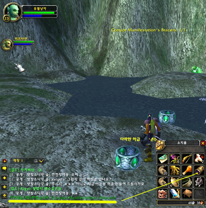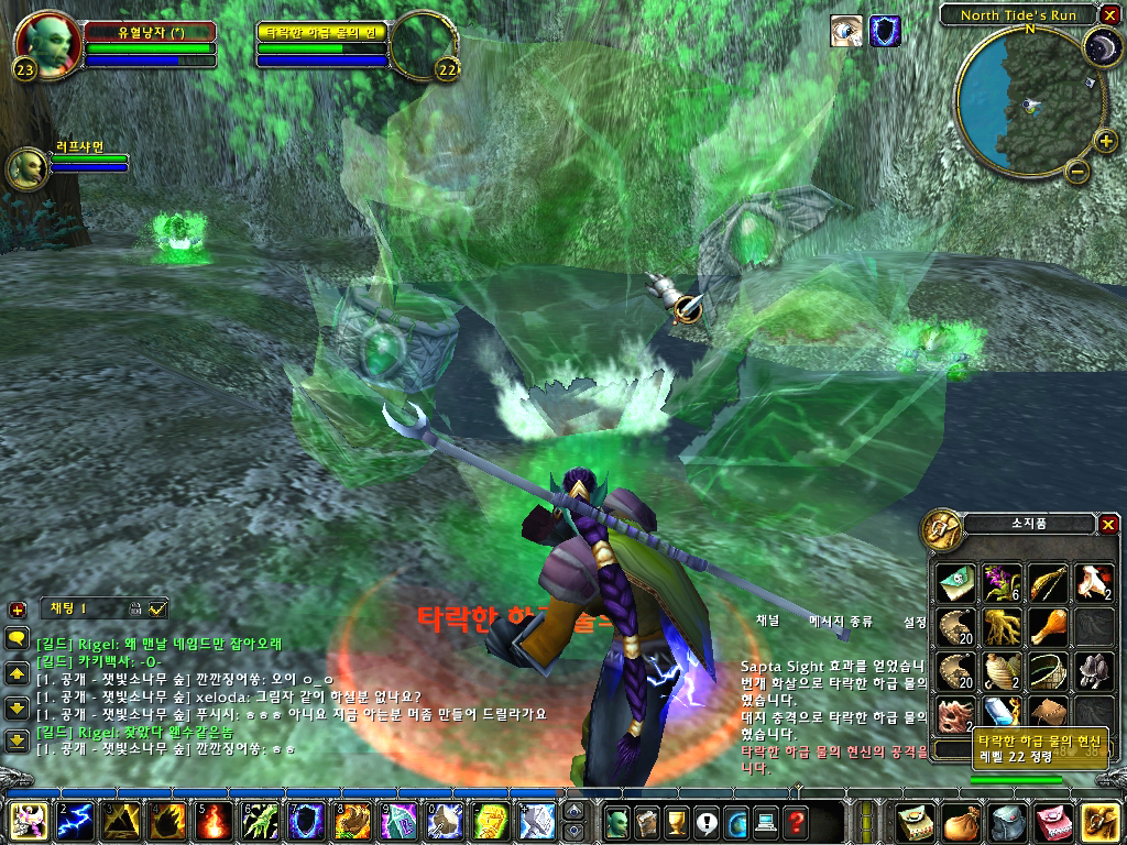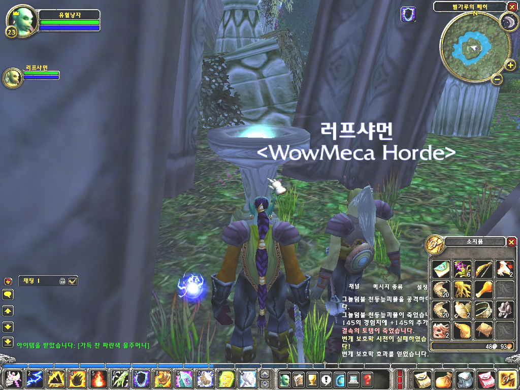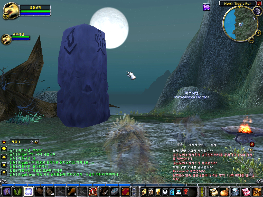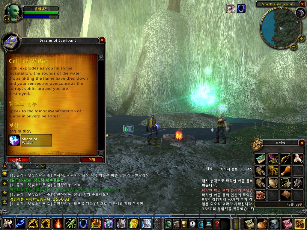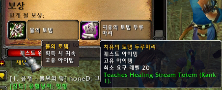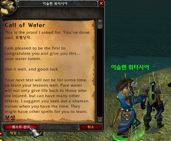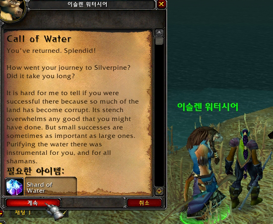 8. 자. 이제 정말로 마지막 여정이다. 하트스톤을 사용하던지, 공동묘지에서 와이번을 타던지 해서 다시 칼림도어 대륙으로 돌아온다. 톱니항 남쪽의 이슬린 워터시어에게 가서 Shard of Water를 건네 주면 보상품으로 물의 토템과 치유의 토템 두루말이를 준다. 경험치 7100