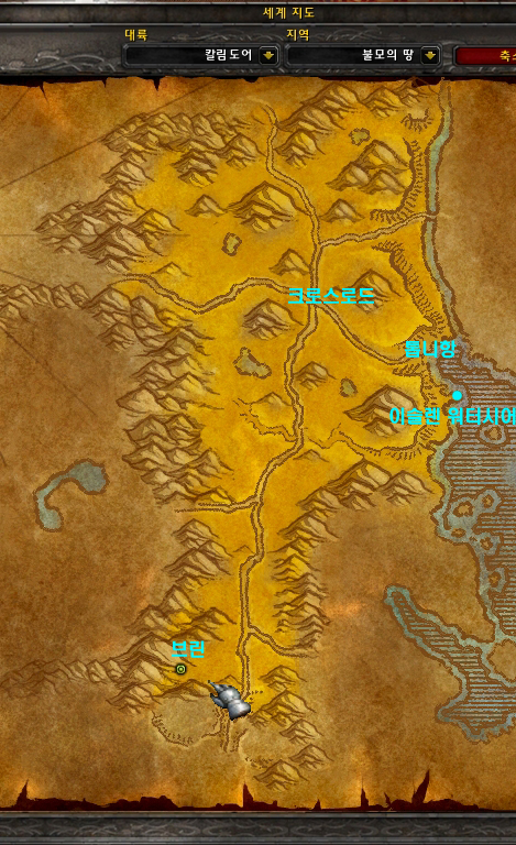 자, 그럼 불모의 땅 남쪽 어디에 브린이라는 NPC가 있을까. 위의 지도에서 브린의