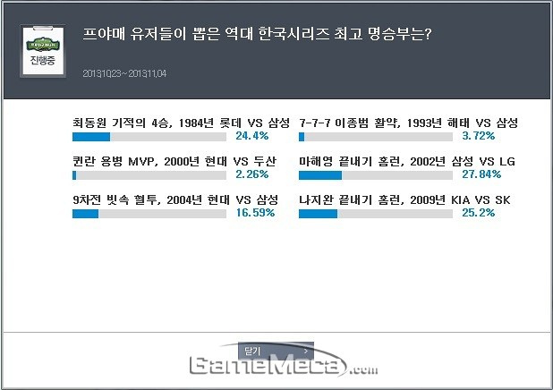 ▲ '프로야구매니저' 에서 조사한 '역대 최고의 한국시리즈 명승부' 설문 결과 (사진제공: 엔트리브소프트)