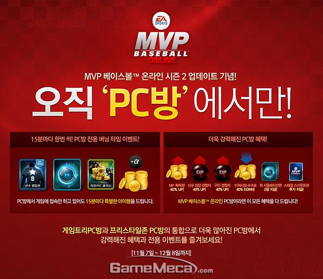 엔트리브소프트는 자사가 서비스하는 'MVP 베이스볼 온라인' 에서 시즌2 업데이트를 기념해 가맹 PC방에서 게임을 즐기는 이용자들을 대상으로 파격적인 혜택을 제공하는 이벤트를 내달 8일까지 실시한다고 밝혔다
