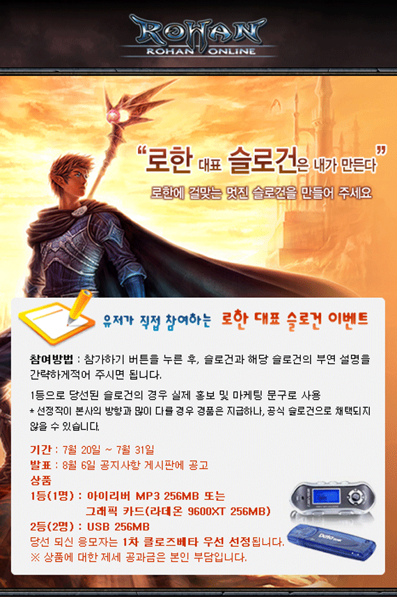 오는 31일까지 실시하는 이번 로한의 대표 슬로건 공모는 `유저가 만들어가는 로한`이란 취지로 처음 개최되는 공식행사로 참여하기 위해서는 직접 만든 독창적인 슬로건과 함께 간단한 부연설명을 적어 공식 홈페이지에 응모하면 된다.