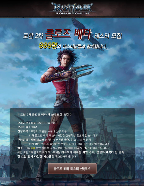 오는 11월 4일까지 실시될 이번 로한의 2차 클로즈베타테스터 모집행사를 통해 써니YNK는 총 999명의 베타테스터를 모집할 예정이며 신청은 로한 공식홈페이지