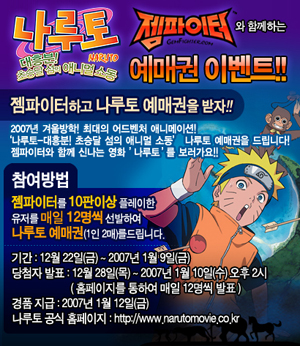 그래텍은 온라인 대전액션게임 ‘젬파이터’와 1월 4일 개봉하는 영화 ‘나루토3-대흥분! 초승달섬의 애니멀 소동(이하 나루토3)’가 공동 이벤트를 진행한다고 22일 밝혔다. ‘나루토3’는 주인공이 닌자가 되기 위해 펼치는 모험 과정을 그린 일본의 인기 애니메이션으로, 그래텍은 젬파이터를 즐기는 유저들을 위해 무료 관람의 즐거움을 마련했다. 이벤트 기간인 22일부터 다음달 9일까지 젬파이터를 10판 이상 즐긴 유저 중 총 228명을 추첨, ‘나루토3’ 예매권 2매씩을 증정할 예정이다. 자세한 내용은 젬파이터 공식 홈페이지(www.gemfighter.com)에서 확인할 수 있다. |