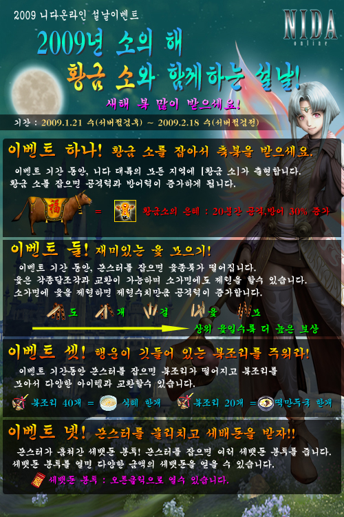 니다 엔터테인먼트는 MMORPG `니다온라인`에서 2009년 새해 맞이 설날 이벤트를 실시한다.