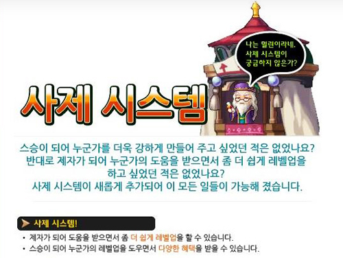 ‘사제시스템’은 고레벨 유저가 저레벨 유저에게 자신의 게임 노하우를 가르치며 성장을 도와 주는 멘토링 시스템으로 적응기간이 필요한 초보 유저들에게 큰 도움이 될 수 있다.