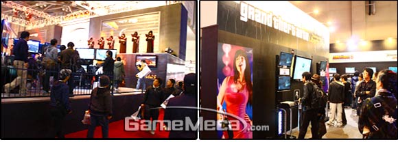 이번 지스타에서는 노출이나 소음, 체험등급에 대한 기준이 그 어느 때 보다 까다로웠다. 조직위에서는 지스타가 수치적으로 작년보다 우위에 있어야 한다는 사실에 압박을 느끼면서도 ‘걸스타’라는 오명을 벗고 ‘글로벌 게임쇼’라는 타이틀을 안착시키기 위해 많은 노력을 기울였다. 부스 관련 규정 강화는 이런 노력의 일환이라고 할 수 있고 부스를 마련한 업체 역시 이를 잘 지켜 성공적인 결과를 끌어낼 수 있었다. 하지만, 일부 업체에서 정해진 규정을 지키지 않아 관객들에게 피해를 주거나 규정을 지키되 규정의 의미를 이해하지 못해 구색만 맞춘 형태로 행사를 운영해 아쉬움으로 남았다. 27일, 평일 마지막 날이었던 이날 행사에서는 NHN, 블리자드 등 대형부스를 마련한 업체에서 각종 이벤트 및 부대행사를 하면서 규정에 넘는 소음은 물론, 자사의 부스로 관람객들을 더 많이 유치하려는 경쟁까지 붙어 귀를 막지 않고서는 지나갈 수 없는 극심한 소음공해를 일으켰다. 조직위 측에서 몇 차례 경고가 있었지만 여전히 규정을 벗어난 소음을 내서 많은 관람객들에게 피해를 주었다. 게임 플레이 영상에 대한 규제도 문제로 지적됐다. 콘솔게임관에 전시된 ‘GTA 4’나 네오위즈의 ‘에이지오브코난’ 역시 미성년자가 플레이 할 수 없게 규정된 게임이고 플레이 제한 역시 잘 지켜졌지만, 플레이만 할 수 없지 빤히 다 볼 수 있는 곳에 대형 스크린이 위치해 있어 가족단위 참관객이 몰렸던 주말에 피가 튀고 머리가 잘리는 등의 폭력적인 장면이 고스란히 노출됐다. 이에 대해 조직위 측에서도 문제의 심각성을 인식하고 규정을 마련하겠다고 밝혔지만, 행사는 이미 막바지에 치닿아 규정을 만들고 다시 지시하기엔 이미 늦어 있었다. |