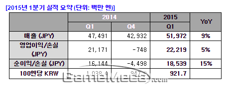 넥슨은 14일, 도쿄증권거래소 공시를 통해 2015년 1분기 연결실적을 발표했다. 넥슨은 이번 분기에 매출 519억 7,200만 엔(한화로 4,790억 원), 영업이익 222억 1,900만 엔(한화로 약 2,048억 원), 순이익 185억 3,900만 엔(한화로 1,709억 원)을 달성했다. 2014년 1분기와 비교하면 매출은 9%, 영업이익과 순이익은 각각 5%, 15% 오른 수치다. 적용환율은 100엔 당, 921.7원 기준이다.