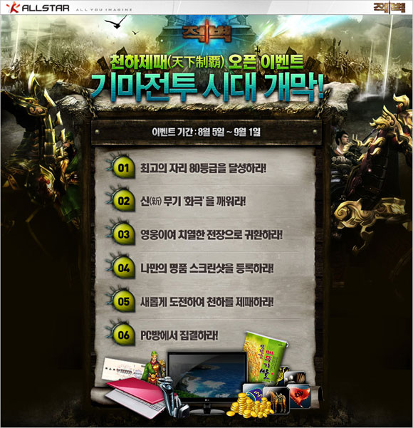 한편, `적벽`은 ‘천하제패’ 업데이트를 기념해 8월 5일부터 9월 1일까지 모든 유저가 참가할 수 있는 6가지 이벤트를 진행하고, 추첨을 통해 ‘노트북’, ‘LCD모니터’, ‘백화점 상품권’ 등 푸짐한 경품을 제공한다.