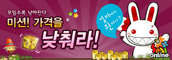 `씰 온라인’은 최근O/X 퀴즈, 몬스터 이름 짓기 등 다양한 유저 이벤트로 큰 호응을 얻고 있는 가운데, 또 따른 유저 참여 이벤트로 더 많은 게임 아이템 보관이 가능한 ‘은행 확장 이용권’의 가격을 정하는 “미션! 가격을 낮춰라!” 이벤트를 실시한다.
