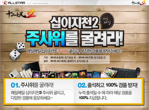 이벤트는 게임 출석 및 플레이 등을 통해 포인트를 이용해 주사위를 굴려 나온 숫자만큼 캐릭터를 이동시키고, 이동한 칸에 해당되는 경품에 자동 응모 되는 방식으로 진행된다. 응모횟수가 많을수록 당첨 확률이 올라가며, 주사위 굴리기와는 별도로 게임 출석일수에 따라 고급 게임 아이템을 100% 추가로 받을 수도 있다.