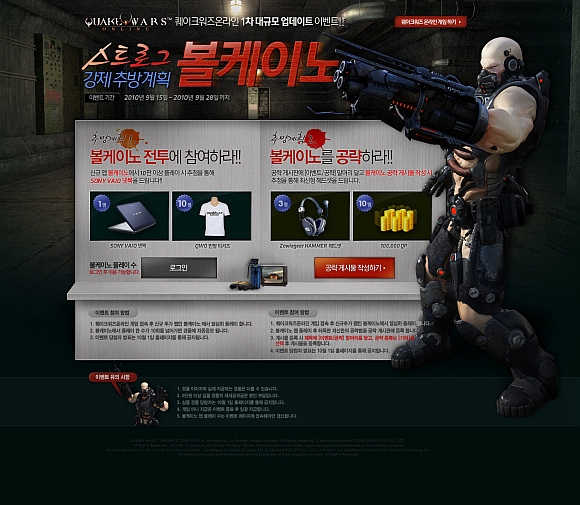 한편, 1차 대규모 업데이트 실시를 기념하는 ‘스트로그 강제추방 계획’ 이벤트도 금일부터 오는 28일까지 진행된다. 이번 이벤트는 신규 게임맵 ‘볼케이노’ 공략법이 담긴 게시물을 공식 홈페이지에 게재하거나 이벤트 기간 동안 해당 맵을 10판 이상 플레이한 열혈 게이머를 대상으로 추첨을 통해 소니 넷북, 조이기어 게이머 전용 헤드셋, QWO 반팔 티셔츠, 10만 게임머니(QP) 등 푸짐한 경품을 증정할 계획이다.