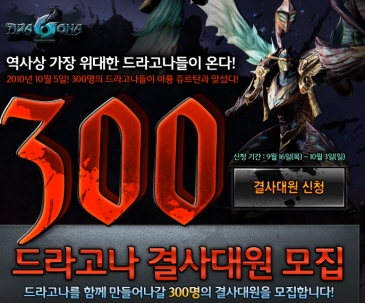 ‘드라고나 300 결사대원’은 9월 16일부터 10월 3일까지 공식 홈페이지(http://dragona.gameclub.com)에서 모집하며, 누구나 신청이 가능하다. 선정된 300명의 결사대원은 오는 10월 5일부터 20일까지 시간 제한 없이 별도로 마련된 결사대 서버에서 게임을 진행할 수 있으며, 게시판을 통해 문제 사항 및 건의 사항을 제시할 수 있다.