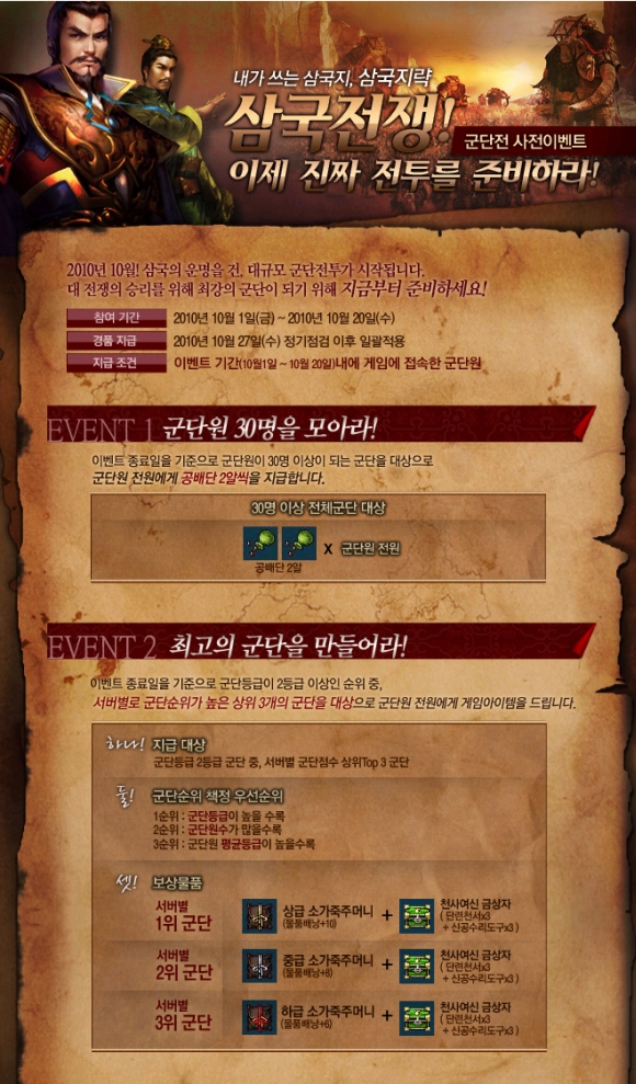 대규모 군단전을 앞두고 군단 모집을 활성화하기 위한 사전 이벤트가 10월 1일부터 20일간 진행된다. 먼저 군단원이 30명 이상 되는 군단을 대상으로 게임 아이템 공배단을 전원 증정하는 군단원 모집 이벤트와, 결성된 군단이 2등급 이상으로 군단 순위가 높은 서버별 상위 3개 군단을 대상으로 소가죽 주머니와 천사여신 금상자 등의 고급 아이템을 전원 증정하는 이벤트가 마련됐다.
