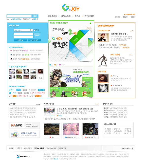 ‘지엔조이’는 그라비티가 서비스하는 게임들을 통합 아이디로 편리하게 이용하고, 게임 유저에 특성화된 커뮤니티 서비스를 즐길 수 있다. 자신을 표현하고 게임 친구들과 교류할 수 있는 공간 ‘조이룸’을 비롯해 유저들의 재미있는 이야기를 공유하는 ‘리얼스토리’, 그라비티 게임에 대한 이야기를 나누는 ‘게임스토리’, 친구 찾기 및 친구 관리 서비스를 제공하는 ‘마이커넥션’ 등 다양한 콘텐츠를 제공한다.