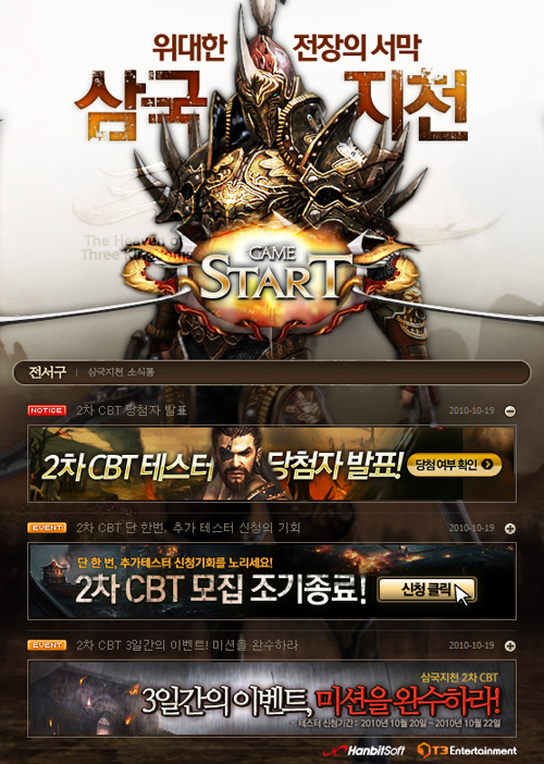 <삼국지천>의 2차 비공개테스트 당첨자 확인 및 추가 테스터 모집에 대한 자세한 사항은 공식 홈페이지(http://three.hanbiton.com)에서 확인할 수 있다.