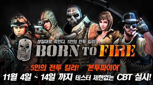 펀트리가 개발한 FPS게임 5인의 전투킬러 ‘본투파이어’가 초기화 없는 비공개테스트를 11월 4일부터 14일까지 총 11일간의 일정으로 시작한다고 밝혔다.