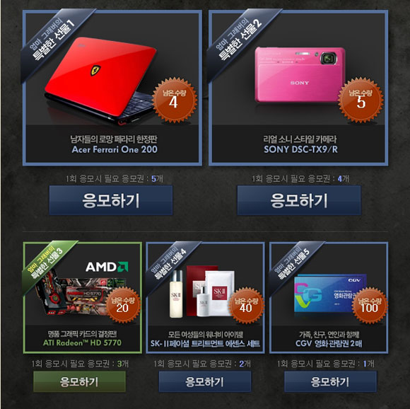 레벨에 상관없이 누구나 쉽게 참여할 수 있는 ‘하늘에서 경품이 비처럼 내려와’ 이벤트에 응모한 유저들은 AMD에서 GE 유저들을 위해 지원하는 ATI Radeon HD 5770 그래픽 카드와 ACER 페라리 원 200 노트북(한정판) 경품 응모권을 받을 수 있다. 또 영화 관람권과 명품 화장품, 디지털 카메라 등의 현물 경품에 응모할 수 있으며, 실시간으로 당첨을 확인 할 수 있다.