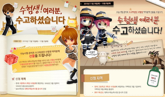 `수험생 응원 패키지` 이벤트는 현재 고등학교 3학년 수험생에 해당하는 1992년 3월 1일부터 1993년 2월 28일 출생한 회원과 2011학년도 수능에 응시한 수험생 회원 중 신청자 전원에게 깜짝 선물 `수험생 응원 패키지`를 지급한다.