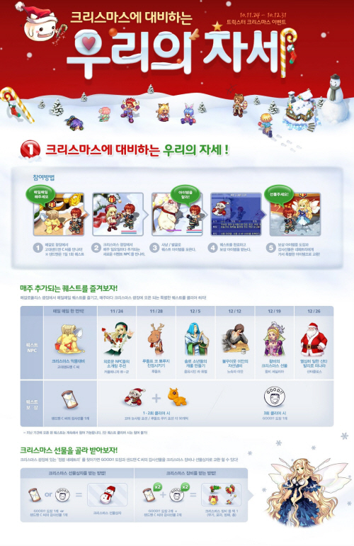 이번 업데이트를 기념하여 ‘트릭스터’는 12월 31일까지 크리스마스 이벤트를 실시한다.먼저, 이벤트에 참여를 원하는 게이머는 ‘메갈로 광장’에서 게임 내 캐릭터인 ‘고대샌드맨 C씨’를 만나 1일 1회 퀘스트를 받고 수행하면 된다. 또한 이벤트 맵인 ‘크리마스 광장’에서 매주 일요일마다 추가되는 ‘루돌프’, ‘산타클로스’ 등 새로운 NPC를 만나 퀘스트를 완료하면 된다.퀘스트를 완료한 게이머는 이벤트 퀘스트 보상 아이템을 통해 크리스마스용 장비나 다양한 아이템이 들어있는 선물상자를 받을 수 있다.