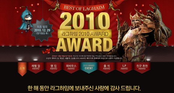 2010년 1월부터 오는 12월 29일까지의 성적을 통합해 발표되는 수상자의 캐릭터와 계정은 `라그하임` 홈페이지에 새롭게 신설될 `2010 어워드` 페이지에 영구 등록되며, 부상으로 게임 명예 아이템을 지급할 예정이다.