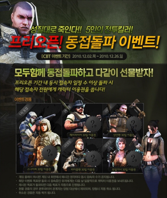 또, 클랜원 10명이 하사로 진급하면 클랜 전원에게 레어 무기 아이템 5종을 사용할 수 있는 이용권을 증정한다. 마지막으로 동시 접속자 수가 일정 수 이상 돌파 할 경우 해당 접속자 전원에게 캐릭터 이용권을 증정하는 이벤트도 진행한다. 프리오픈 기념 이벤트는 12월 2일부터 26일까지 진행한다.