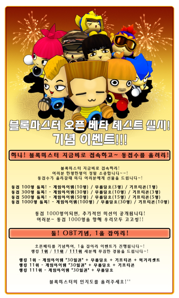 현재 OBT를 실시중인 `블록마스터` 에서는 동시 접속자 수가 증가할 때마다 추가로 유저들에게 아이템을 지급하는 "동접수를 올려라" 이벤트와 랭킹 1위, 11위 111위 등 숫자 `1` 에 연관된 랭킹의 유저들에게 상품을 지급하는 "1을 잡아라" 이벤트를 실시 중이다.