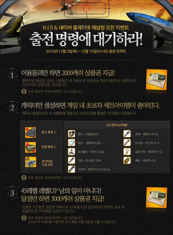 `HIS` 는 이번 플레이넷 채널링을 기념하여 다양한 이벤트를 준비하였다. 플레이넷 채널링 서비스 이용동의만 하면 모든 사용자들에게 `HIS` 2천 캐쉬 상품권을 지급하는 것 외에, 신규 사용자들에게 초반 게임을 편하고 빠른 레벨업을 도와주는 ‘초보자 세트’ 아이템을 지급한다. 뿐만 아니라 45레벨을 달성하면 3천 캐쉬 상품권을 지급하는 등 다양한 이벤트를 준비하였다.