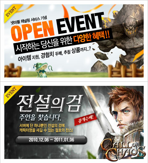 이번 채널링 서비스를 통해 `넷마블` 의 회원은 별도의 회원가입 없이 누구나 간단한 인증만으로 `콜오브카오스` 를 즐길 수 있다. 이와 함께, 서비스 오픈을 기다려 준 많은 유저들을 위해 이벤트를 준비했다.