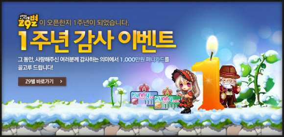 한게임은 지난 해 12월 오픈 베타 서비스로 첫 선을 보인 캐주얼 게임 `내맘대로 Z9별(이하 지구별)` 의 서비스 1주년을 맞이해 한 해 동안 `지구별` 에 많은 성원을 보내준 유저들에게 감사의 마음을 전하는 `1주년 기념 이벤트` 를 1월 2일까지 개최한다.