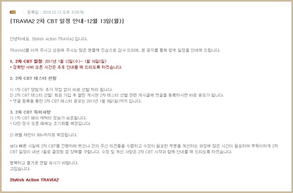 이번 테스트는 1차 CBT에 참여했던 테스터에겐 100% 접속 권한을 제공하며, 추가로 2차 CBT에 참여할 인원을 따로 선발할 예정이다. 2차 CBT 테스터 응모는 공식 홈페이지의 2차 테스터 선발 게시판에 댓글로 등록 하면 된다.