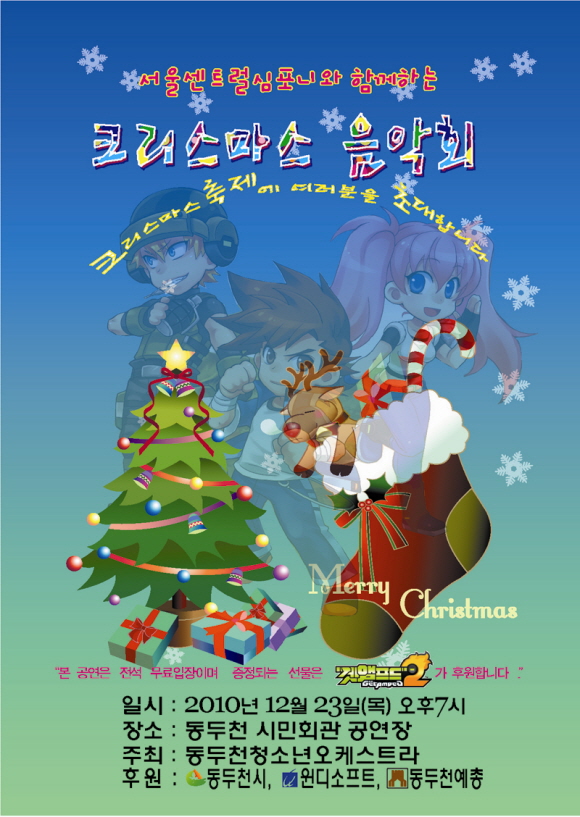 윈디소프트의 신작 `겟앰프드2` 가 동두천시와 함께 자사가 후원하는 동두천청소년오케스트라단의 연주로 한겨울 추위를 녹일 무료 크리스마스 음악회를 개최한다고 밝혔다. 동두천 시민회관 공연장에서 음악회 공연을 갖는 `동두천청소년오케스트라단` 은 윈디소프트와는 3년째 인연을 맺고 있다