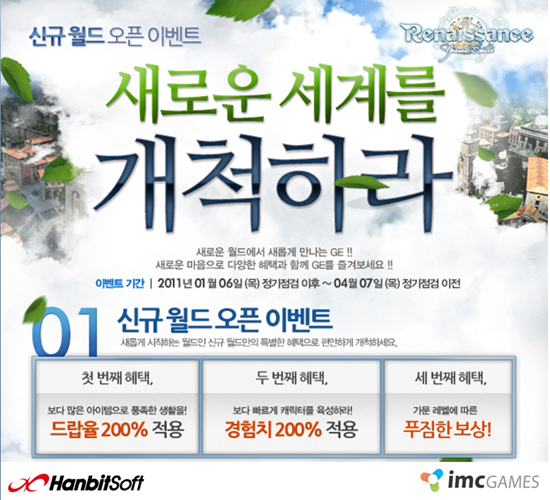 이번에 오픈한 신규월드는 겨울방학을 맞아 신규 유저와 복귀 유저들이 가문을 새롭게 육성하는데 편의를 돕기 위한 서버로 신규 월드 가문 생성자 모두에게 획득 경험치와 아이템 드롭률이 200% 상시 적용된다.