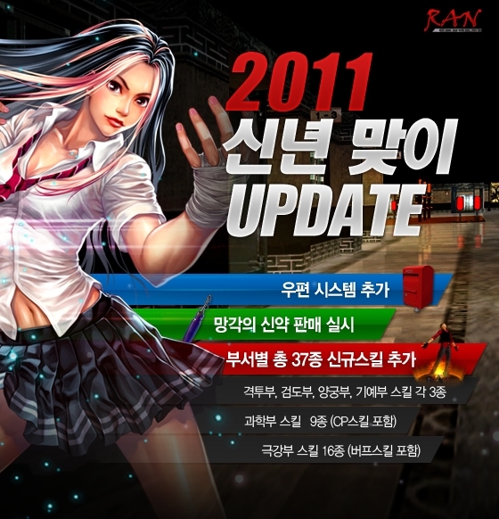 민커뮤니케이션은 자사가 개발하고 서비스하는 학원액션RPG `란온라인`이 2011년을 맞아 1월 12일, 신년 업데이트를 실시한다고 밝혔다.