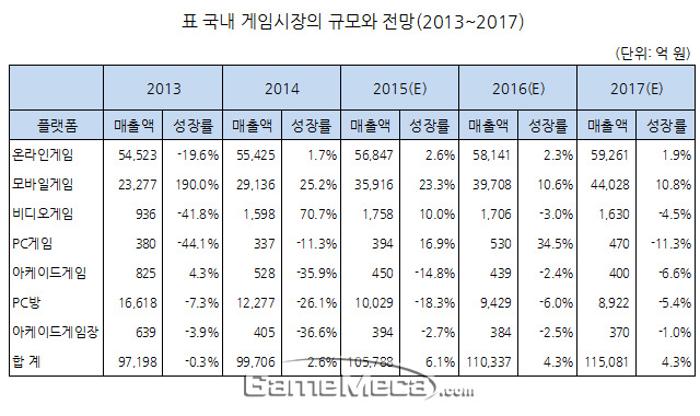 온라인게임이 전년보다 상승 폭을 일정 확대하고 모바일게임이 여전히 큰 폭의 성장세를 이어감으로써 전체 시장의 성장을 견인한다는 것이다. 또한 2016년과 2017년 게임시장은 온라인게임이 소폭의 성장세를 유지하고, 모바일게임의 성장세가 둔화되는 가운데 평균 4.3%의 성장률을 이어가며 11조원 대 규모의 시장을 형성해 나갈 것으로 예측했다.