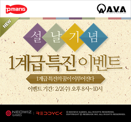 먼저 밀리터리 FPS게임 `아바(A.V.A)` 는 설 명절을 맞아 1계급 특진 파격 이벤트를 준비했다. 설 전날인 2월 2일 저녁 8시부터 10시까지 게임을 즐기는 이용자에게는 계급을 한 단계 특진시켜준다. 또한 윷놀이 이벤트도 2월 13일까지 진행한다. 게임을 즐기면 받을 수 있는 윷 던지기 기회를 통해 윷을 던지면, 각 칸에 해당하는 아이템을 지급한다.