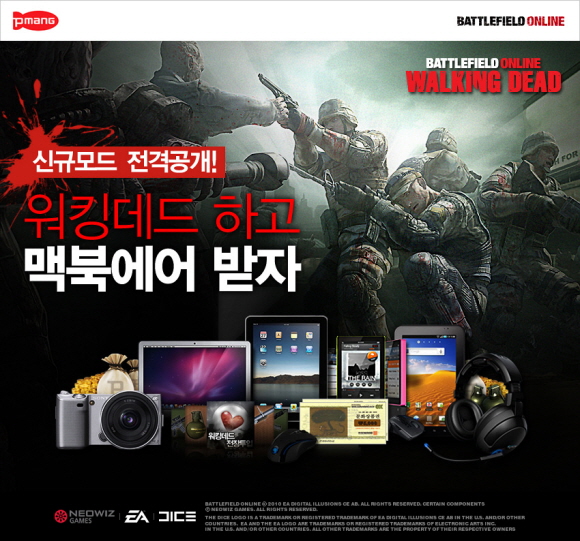 대규모 전장 FPS ‘배틀필드 온라인’ 도 설 명절에 즐길 수 있는 신규 AI모드 ‘워킹데드’를 선보임과 동시에 다양한 경품이벤트를 준비했다. 오는 2월 28일까지 진행되는 이번 이벤트는 총 3가지 미션으로 나뉘어지며, 첫번째 미션을 완료하면 맥북 Air 노트북, 갤럭시 탭, 23인치 모니터 등 대박 경품을, 두번째 미션으로 게임 모드를 200판 이상 플레이 한 이용자에게는 고급 게임 아이템을 지급하며, 최초 달성자에게는 아이패드도 제공할 예정이다. 마지막으로 신규모드를 완료하고 모든 호칭을 획득한 이용자에게는 디지털카메라, 록캣 레이저마우스, 게임 전용 헤드셋을 선물한다.