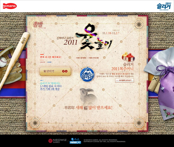 온라인 야구게임 ‘슬러거’ 는 2월 7일까지 윷놀이 이벤트를 진행한다. 게임을 즐긴 후 제공받은 윷 던지기 기회로 윷판에 던지면 말이 이동한 결과에 따라 고급 게임아이템을 지급한다. 아울러 육성모드에 접속만 해도 게임머니가 들어있는 복주머니 아이템을 받을 수 있다.