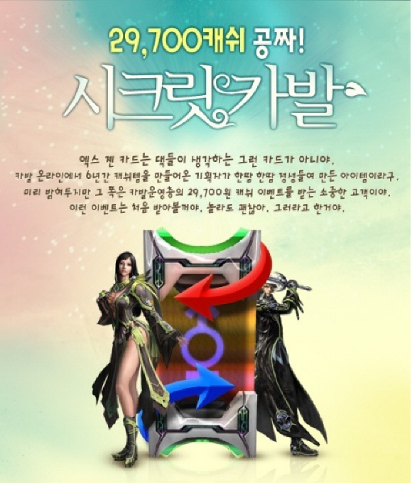 이스트소프트에서 개발하고 서비스중인 MMORPG `카발 온라인` 이 게임 내 캐릭터의 성별을 변경할 수 있는 `엑스젠 카드` 를 무료 지급하는 이벤트를 진행한다. 벤트의 정식 명칭은 `시크릿 카발` 로 모든 유저를 대상으로 26일부터 진행 중이다