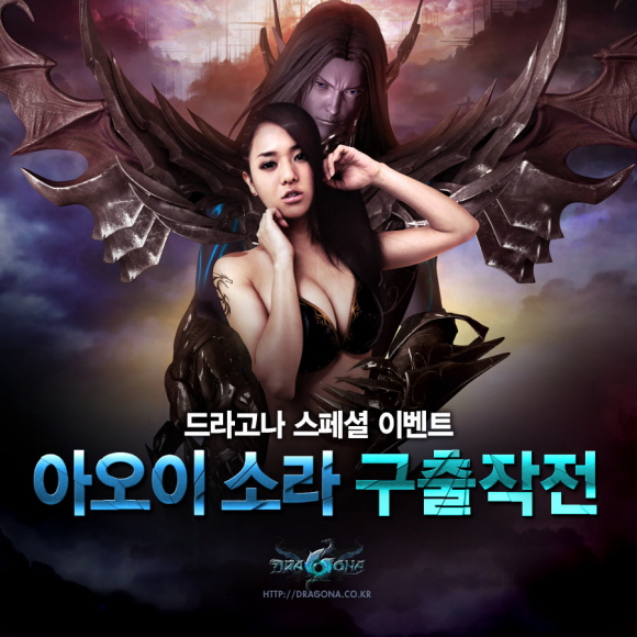 이와 함께 오는 2월 10일에는 `드라고나` 의 홍보 모델인 `아오이소라` 가 게임 내에 등장하는 이벤트가 시작될 예정이다. 10돈 상당의 드라고나 기념 골드바, 백화점 상품권 등 푸짐한 경품이 제공되는 이번 이벤트는 게임 내에서 아오이소라를 납치한 몬스터를 퇴치하고 `소라의 하트` 아이템을 수집하면 자동으로 참여가 가능하다.