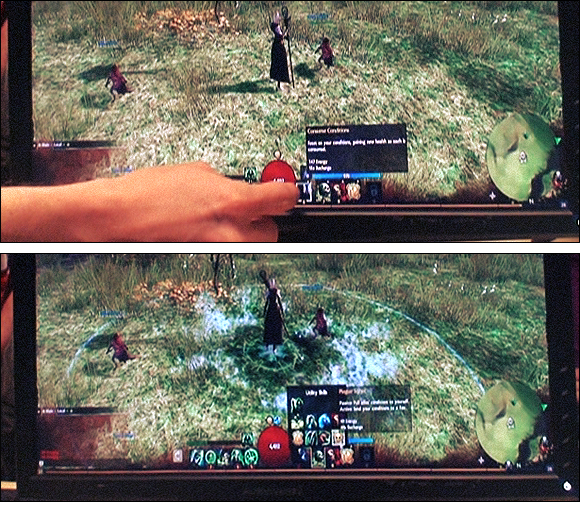 ‘길드워’에서는 스킬 수는 많았지만 완전히 무용지물인 스킬 조합도 나올 만큼 효율적이지 않았다. 그래서 ‘길드워2’에서는 스킬 수를 줄이는 대신 비주얼을 좀더 강조하면서 진입장벽을 낮추는 선택을 했다. 결과적으로 가운데 HP를 두고 양쪽으로 5개씩 스킬슬롯을 만들어졌는데 자세히 보면 왼쪽 5개는 공격스킬이, 오른쪽 5개는 생존이나 방어스킬로 구성되어 있다는 사실을 확인할 수 있을 것이다. 스킬이 적지 않느냐라는 의견이 있지만 공격스킬은 무기를 바꾸거나 스위칭 버튼을 누르면 스킬이 변화는 형태로 다양성을 추구했고 스킬슬롯에 세모 버튼을 눌러 바로 바로 스킬을 교체할 수 있도록 간단하게 만들었다. 길드워에 비하면 자유도가 낮아 보일 수 있는데 우리가 강조하고 싶은 것은 스킬을 보다 쉽게 이해하고 구축할 수 있게 만들었다는 것이다. 이를 통한 재미는 충분히 보장할 수 있다고 생각한다.