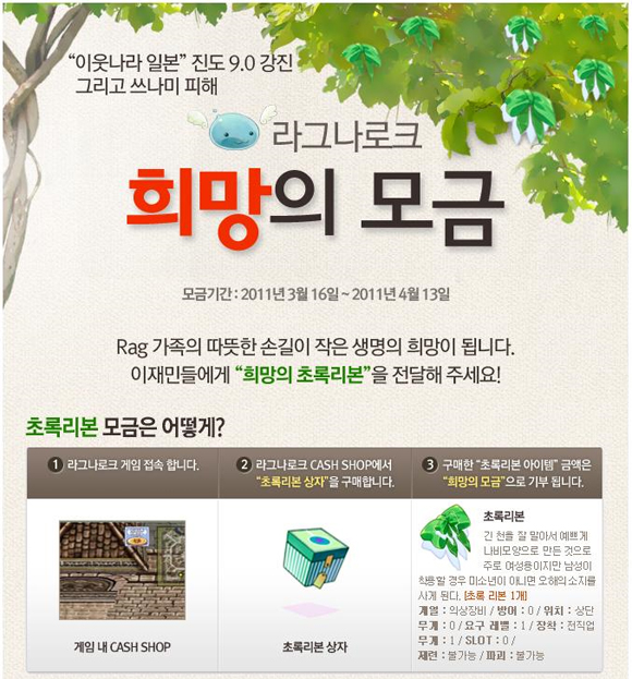 이번 모금은 라그나로크 회원이면 누구나 참여할 수 있으며, 라그나로크 공식 홈페이지에 접속한 후 ‘초록리본’ 아이템을 구매하면 된다. ‘초록리본’ 1개 당 1천원으로 판매되며, 판매 수익금 전액은 피해복구를 위한 구호 자금으로 전달될 예정이다. 또한 일본 대지진 희생자를 애도하고 빠른 피해 복구를 기원하는 희망의 메시지 작성도 가능하다.