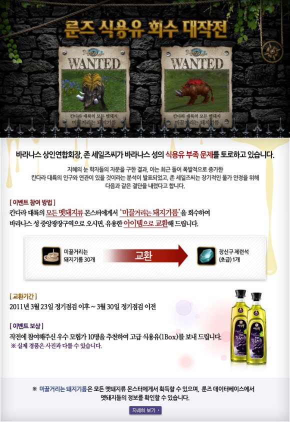 이번 이벤트는 게임 내 멧돼지류 몬스터에게서 드랍되는 ‘미끌거리는 돼지기름’ 아이템을 모아오면 좀더 유용한 아이템인 ‘장신구 초급 제련석’ 및 진짜 식용유로 교환해 주는 이벤트로, ‘식용유 회수 대작전’이라 명명되었다. ‘식용유 회수 대작전’은 3월23일부터 3월30일까지 8일간 진행된다.