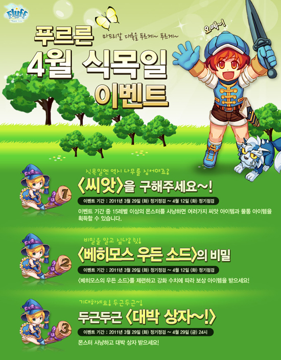 “푸르른 4월 식목일 이벤트”는 금일 29일(화)부터 내달 12일(화)까지 2주간 진행되며, ‘씨앗을 구해주세요~!’와 ‘베히모스 우든 소드의 비밀’ 그리고 ‘두근두근 대박 상자~!’의 꽉 찬 구성으로 게이머들에게 큰 재미를 선사할 예정이다.