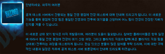 블리자드는 월드 오브 워크래프트(이하 WOW)의 전장 시스템 개선 의지를 밝히고 개선 방법으로 `동일 진영 평점제 전장`에 대한 안내를 공식 사이트의 포럼에서 밝혔다.