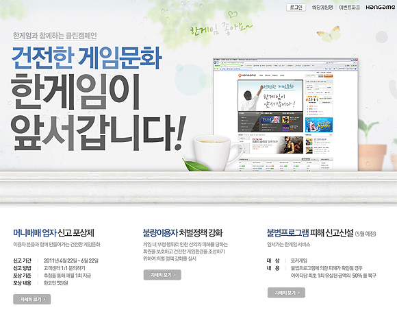 오늘(22일)부터 실시되는 클린 캠페인에는 건전한 게임문화 조성을 위해 게임회원들의 적극적인 신고를 유도하기 위한 ‘머니 매매업자 신고 포상제’와, 불법 프로그램으로 피해를 입은 고객들을 케어하기 위한 ‘불법 프로그램 피해 신고 신설제’ 등이 포함된다.