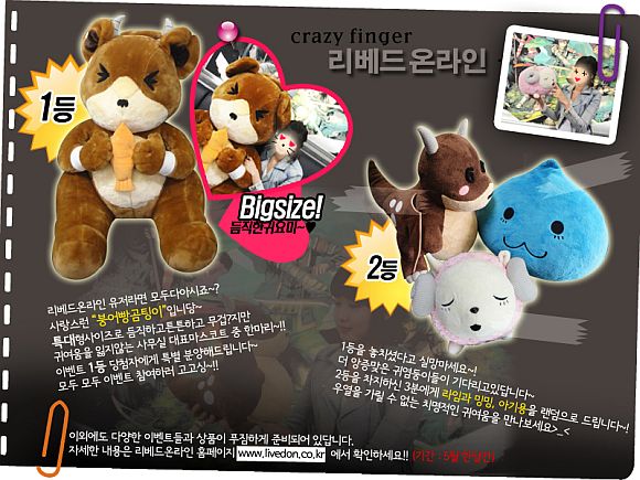 우선 첫번째로 ‘리베드 온라인 출석체크는 이벤트’ 기간 중 `리베드 온라인` 홈페이지에 접속하여 자유게시판에 출석을 위한 글을 남기면 출석체크 응모권을 받고 모아서 캐릭터인형, 캐시 상품권등 원하는 상품에 응모하는 방식의 이벤트이다.