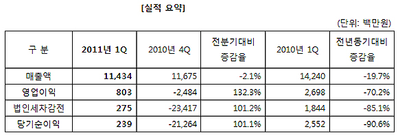 엠게임은 2011년 1분기 영업이익 8억원, 당기순이익 2억4천만원을 기록하며 전분기대비 흑자 전환했다고 밝혔다.