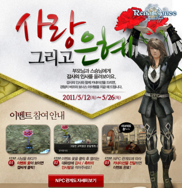 유저는 게임 내 전 지역에서 생성되는 ‘이벤트 꽃’을 획득한 후 부모님과 스승님에 대한 감사의 인사말을 기재하면 ‘카네이션’과 1시간 동안 경험치를 30% 추가로 얻을 수 있다. 이때 획득하는 카네이션은 NPC들간의 스승/제자, 어버이 관계가 있는 캐릭터에게 전달하면 경험치 증가, 던전 출입증과 같은 다양한 유료 아이템을 추가로 얻을 수 있다. 또한, 이벤트 기간 동안 ‘시크릿 가드’ 콘텐츠를 이용해 스승과 제자 관계를 맺고 함께 게임을 하면 추가 경험치 15%를 제공 받을 수 있다.