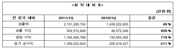 2011년 1분기 매출액은 21억3천1백만원, 매출이익은 5억2백만원, 영업이익은 11억6천4백만원, 분기순이익 12억5천6백만원이다.